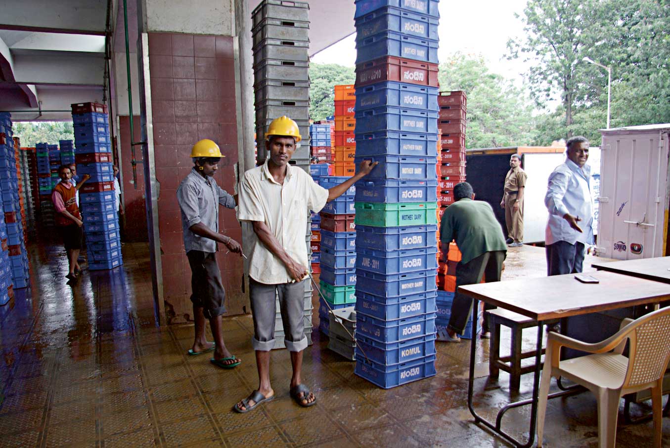 We follow the milk through the dairy. One major problem facing the union is the large number of contract workers, which divides the workforce. Out of the 1,440 workers at the cooperative, 600 are contract workers. Out of these, 50 per cent are women.